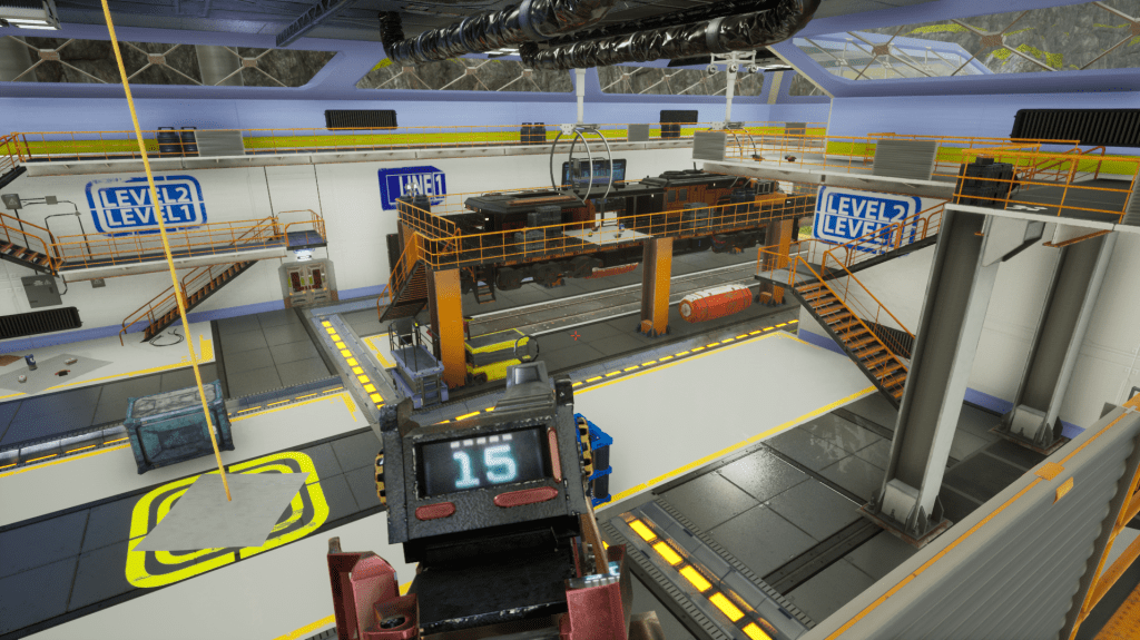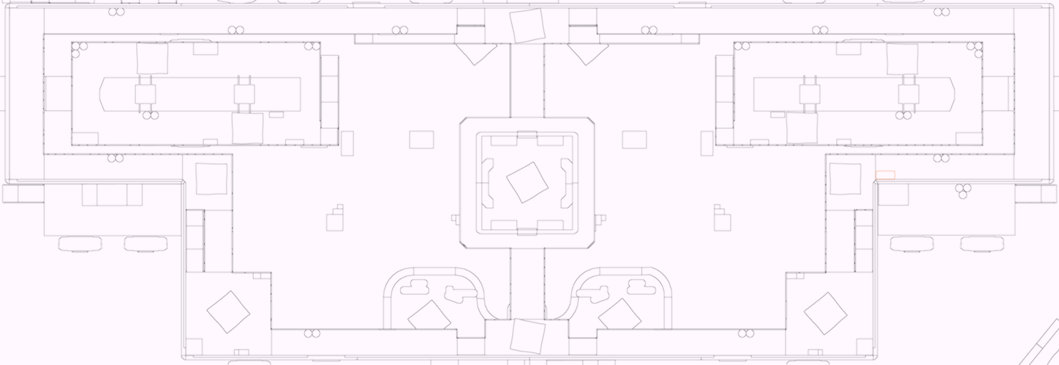 The interior of the building is mirrored on the y-axis, with two levels to traverse between. In the center is a control tower that houses the most valuable loot, and while players could bunker down in here, it could also very easily become a deathtrap. The second floor consists of catwalks which can provide a strong position, but are small to maneuver in and can get them downed if not careful. The first floor has more cover, but is larger and easier to get attacked from above. On either side of the control tower is a zipline that will bring the player to the roof. A train under maintenance sits on a raised platform on each side of the building. The building has two large open doors in front of the trains, two double doors at the front, two double doors at the back, and two open areas on the roof. There are multiple avenues onto the building, and the roof has windows so players can see inside/outside.