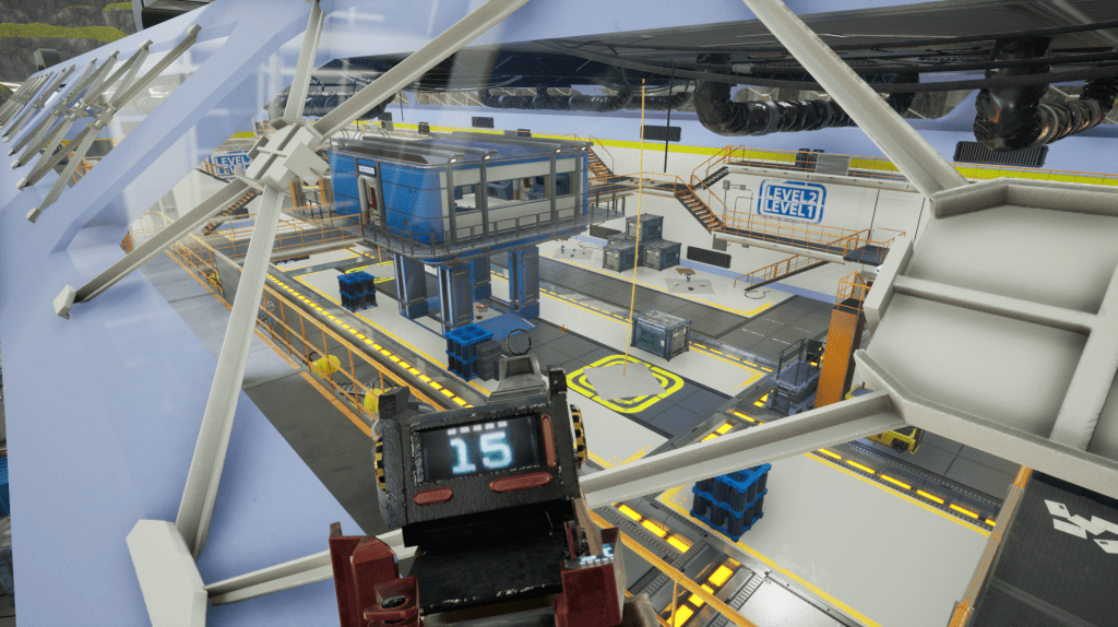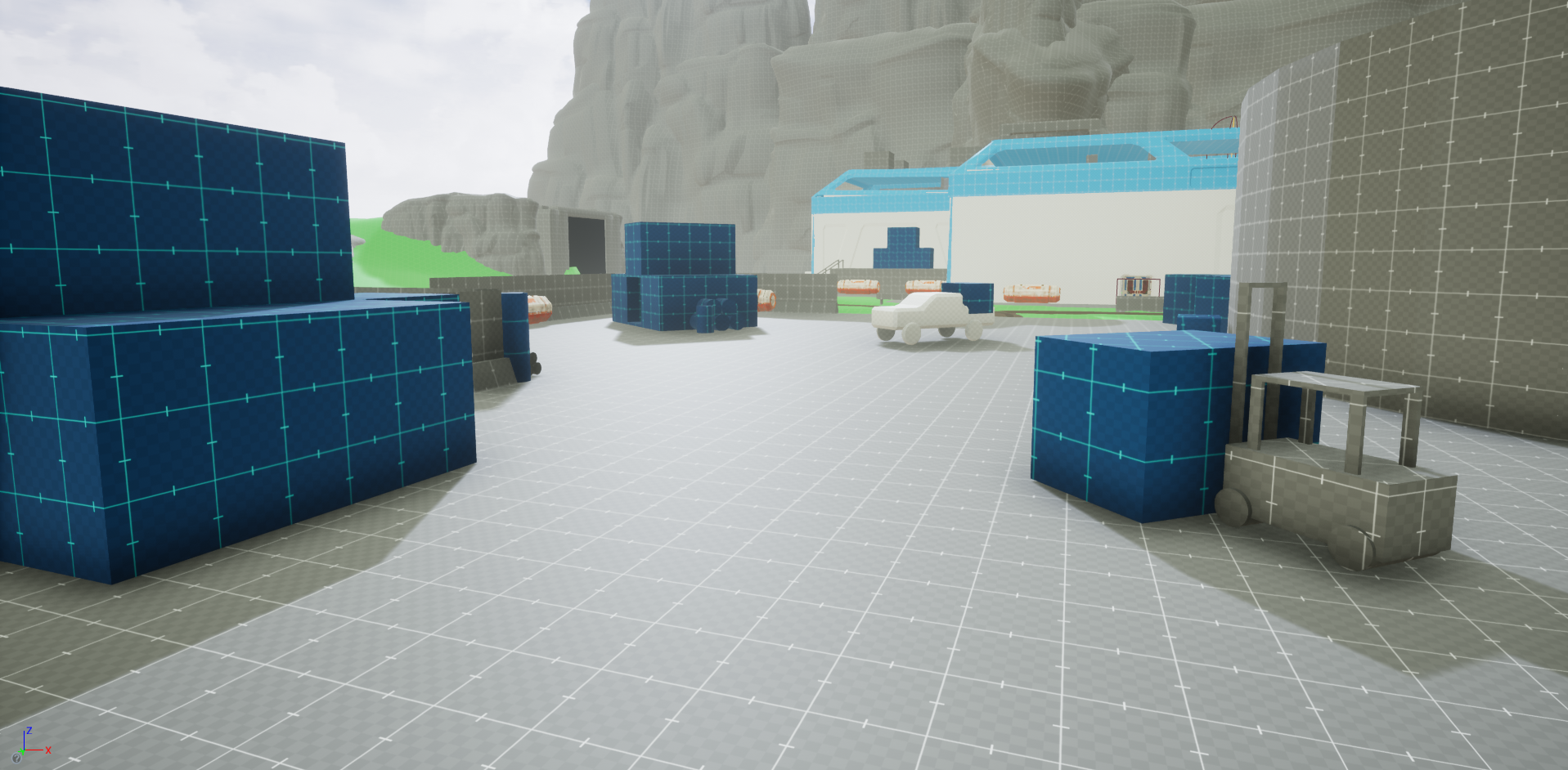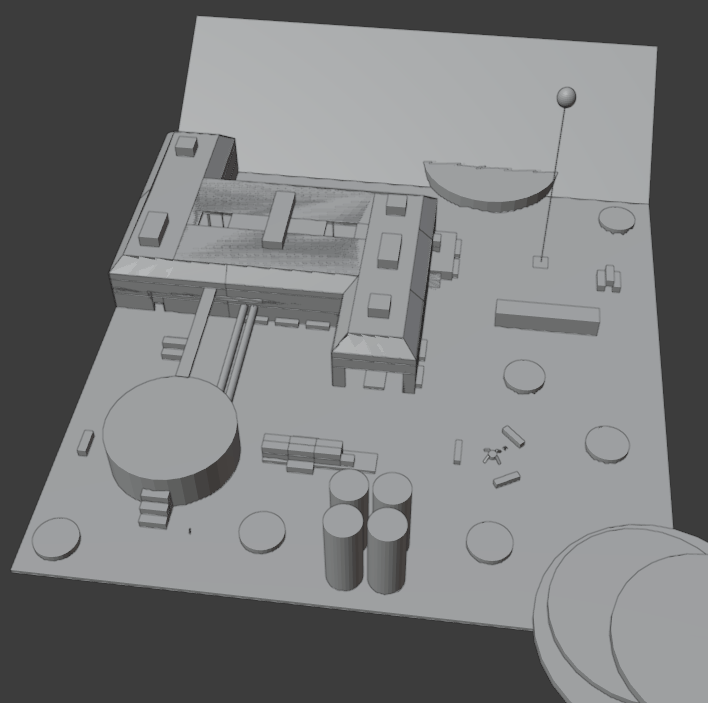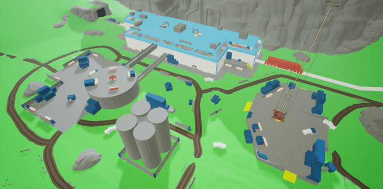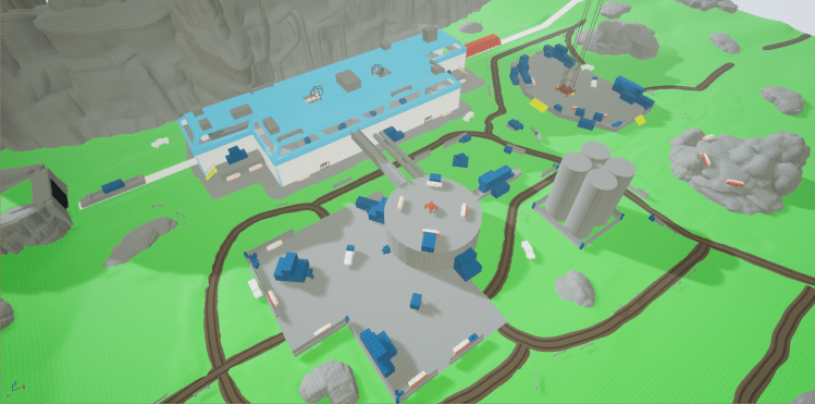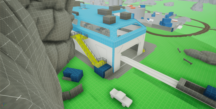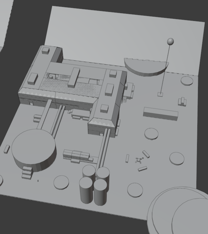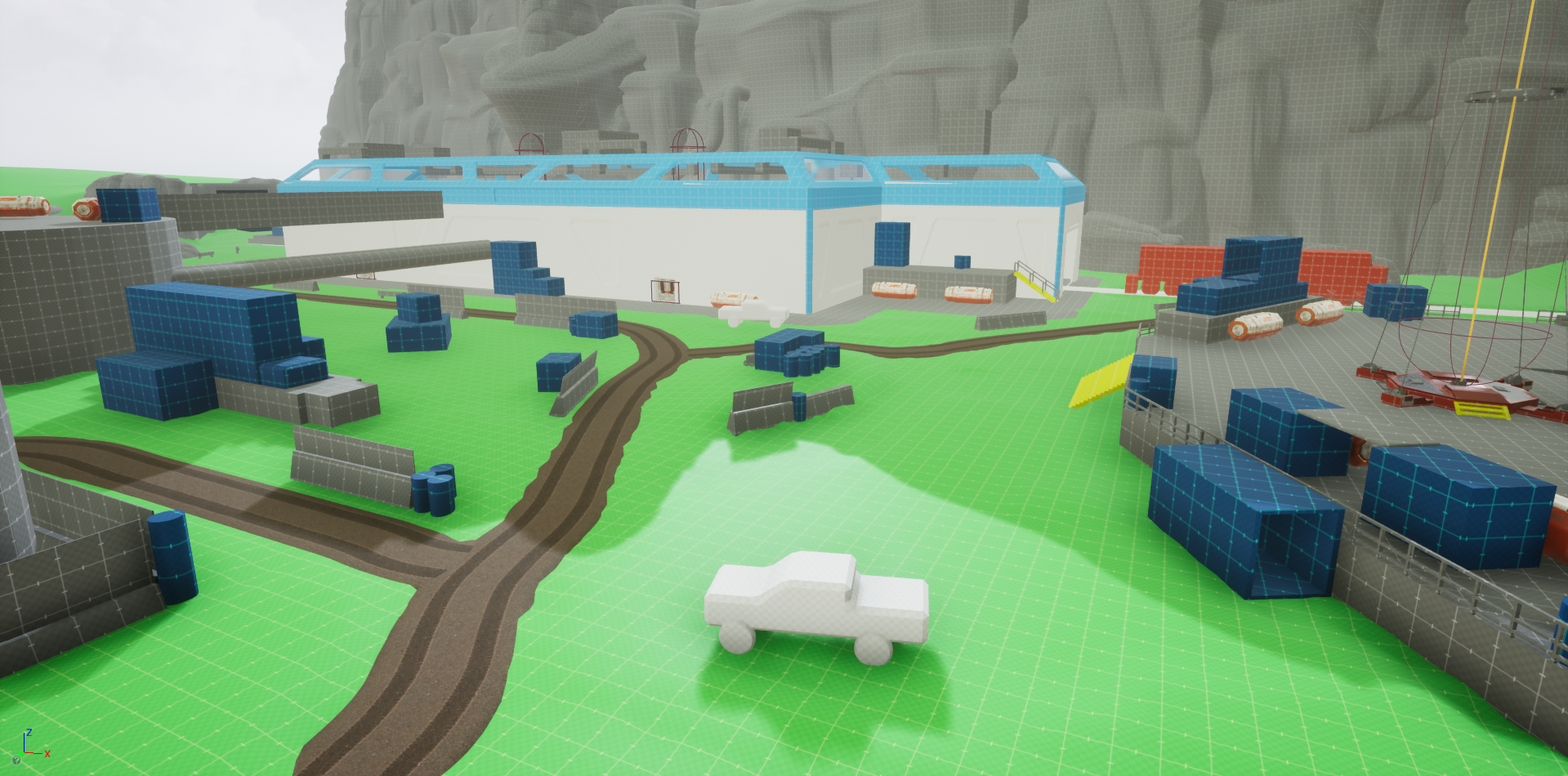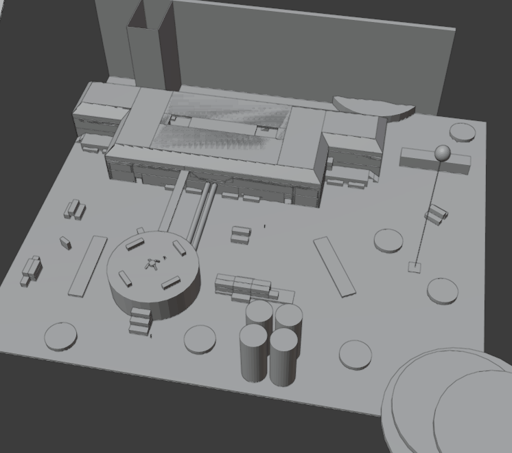 While the previous shape of the building was more interesting to me, it led to an awkward and cramped configuration in the interior. The focus was more on the conveyer belts that ran through the building, so I changed the building to be a more basic shape that housed the trains better and relegated the conveyer belt to a much smaller section of the building. With the building changed, I needed to rearranged the outside as well, so I put more around the Balloon and Respawn Beacon as sort of “hubs” for players to congregate and fight.