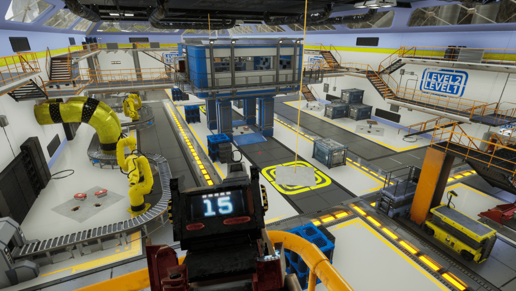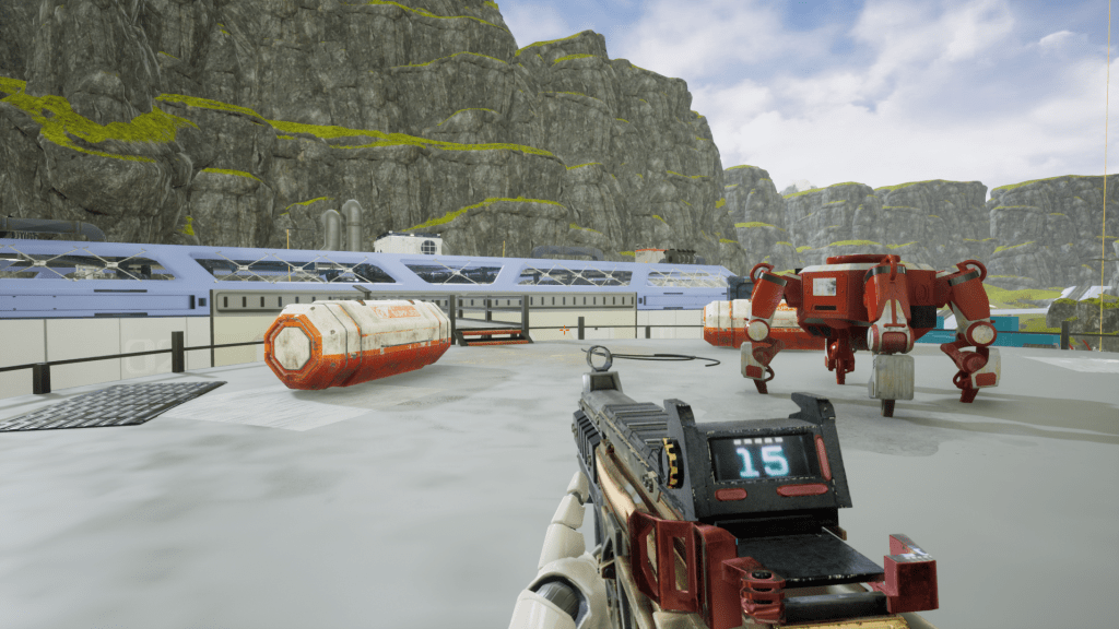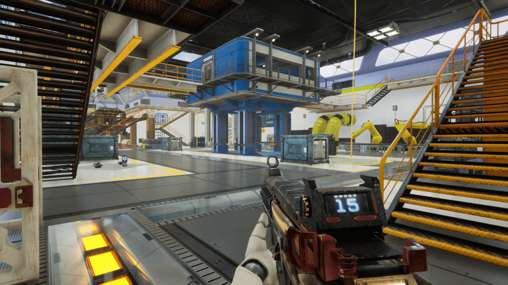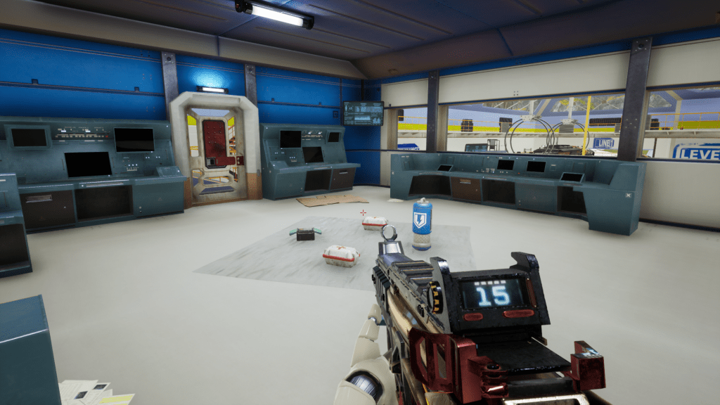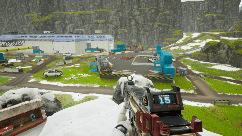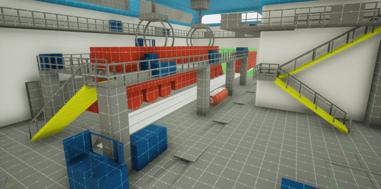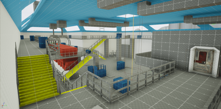 I recreated all the basic movement mechanics in the game (sorry, no bunny hopping!) and even tried to get them as close as I could to the measurements in the game. Players can walk, run, crouch, sprint, slide, jump, and even glide using the balloon. With this movement in mind, I made sure to have multiple avenues for players to either get into or out of a firefight, vertically or horizontally. I tried to place cover (at differing levels of protection) at intervals that felt fair for players to get to safety with enough space that attacking teams could reasonably down an enemy or two. I programmed everything myself.