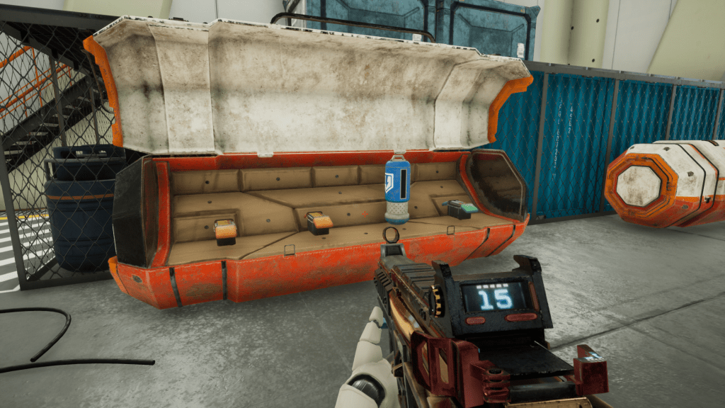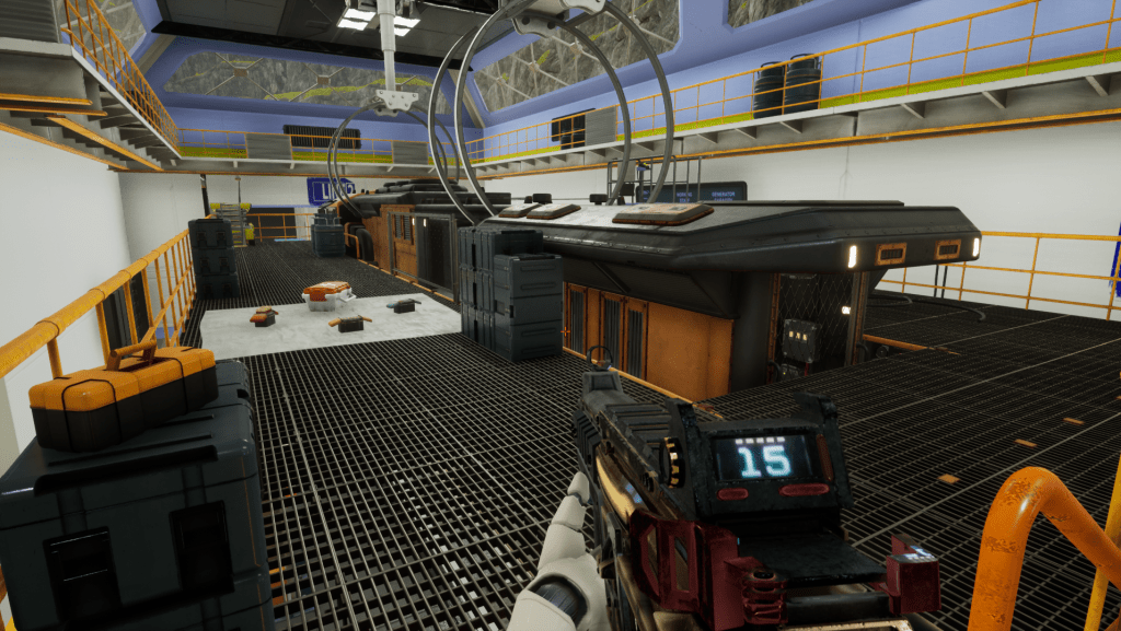 I actually did the final polish much later than the initial blockout, which is why I decided to use the white/blue colors you would find in later versions of World’s Edge. I was able to find a few fan-made assets from the game, which is how I got the wonderful R-99, Loot Crate, Respawn Beacon, and shields/medkit/ammo models. I had to custom model and texture the exterior pieces of the building as well as the doors myself, but everything else I was able to find or I already owned. All in all, the design came through except in one regard. I ended up changing the trains only because I didn’t have the specific asset (or the time to make it) from the game. In my original concept, the train outside the building as well as the ones inside would have had an open interior space players could move through and take cover in, almost acting like mini rooms within the building. Unfortunately, this idea doesn’t come through in the final build, since I had to close off the open section of the train models as it was too easy to get stuck in them.