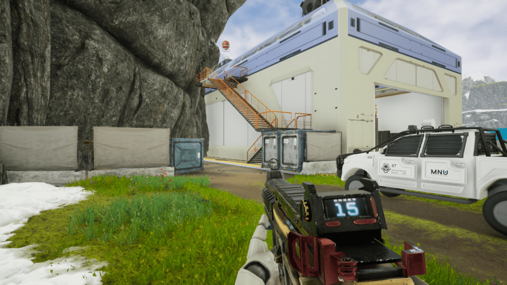 I knew I wasn’t going to be able to implement actual multiplayer in this project, so what I wanted to focus on instead was fun traversal. Apex is known for its fast and fluid movement, and I set out to replicate that in my map, giving players options to zip around the exterior and in and out of the building.